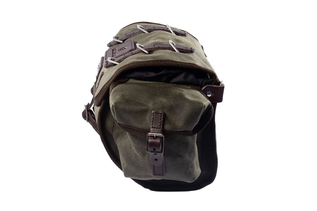 The Barley bag is constructed of a 100% waterproof 18oz waxed cotton duck and hand made in the UK using high quality materials and features 6 metal D ring strapping points on lid for fixing a cape or jacket and 2 handy pockets for organising kit.